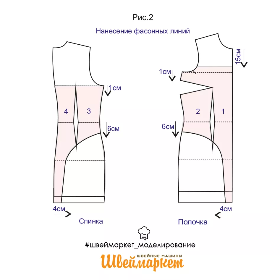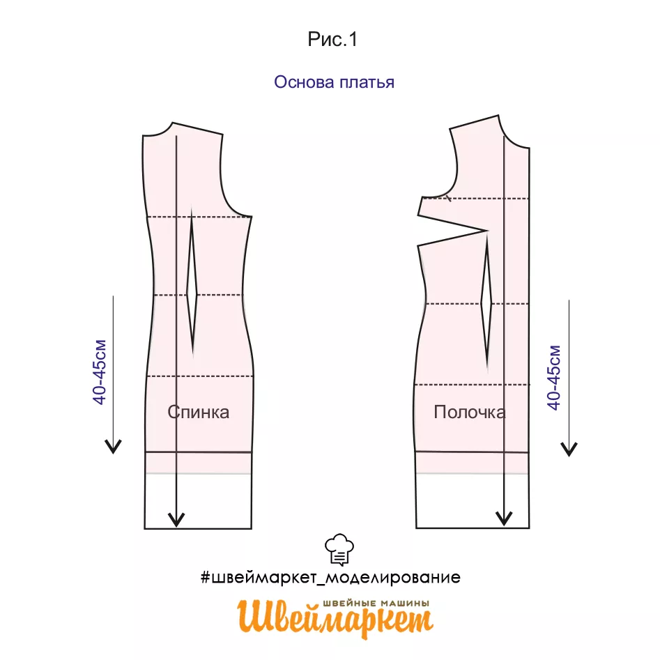 1.Берем кальку, накладываем на нашу основу и обводим детали спинки и полочки, сразу меняя длину платья до выбранной нами (в зависимости от роста рекомендую отложить от талии по спинке и полочке 40-45 см). (Рис.1)