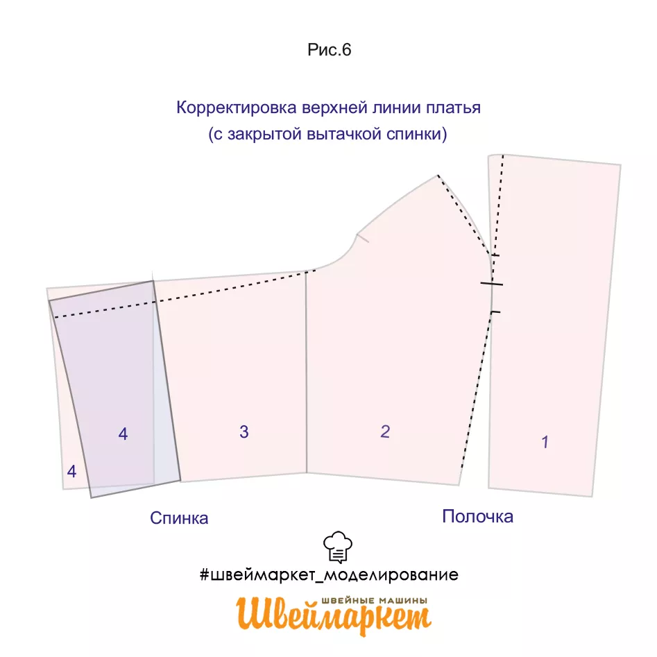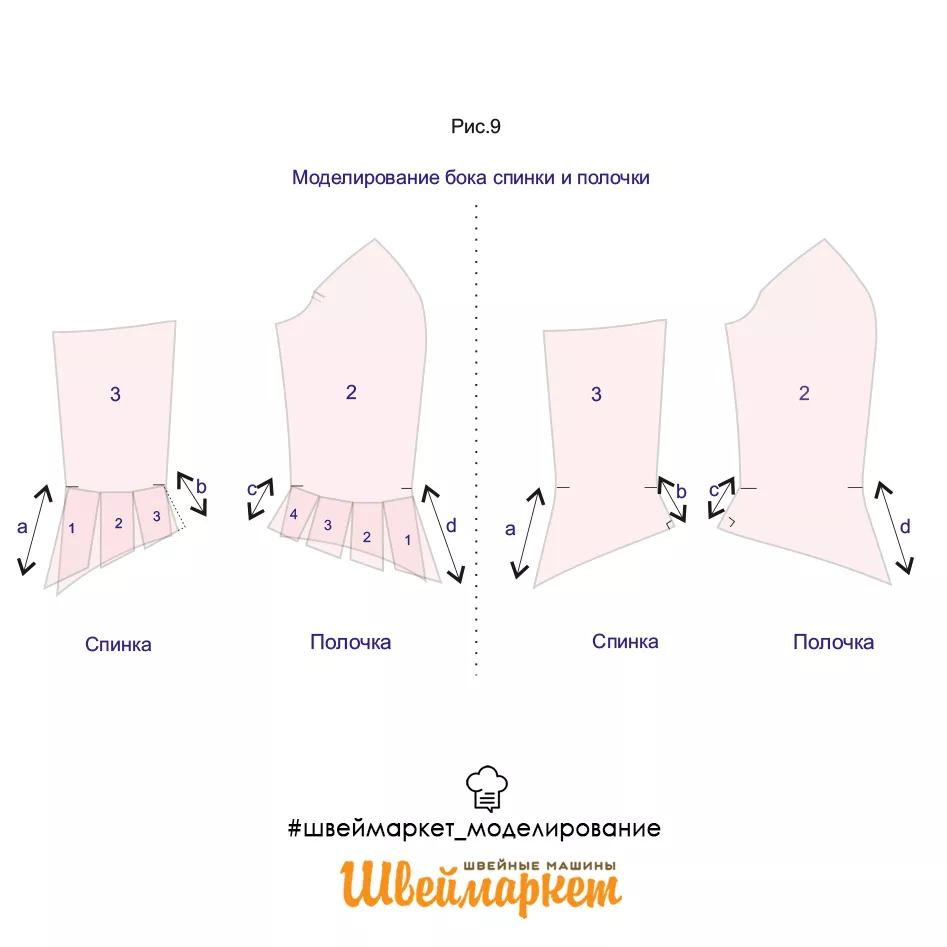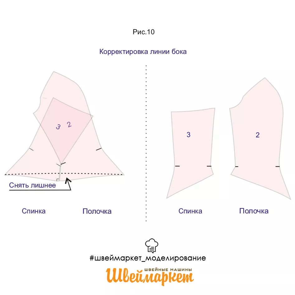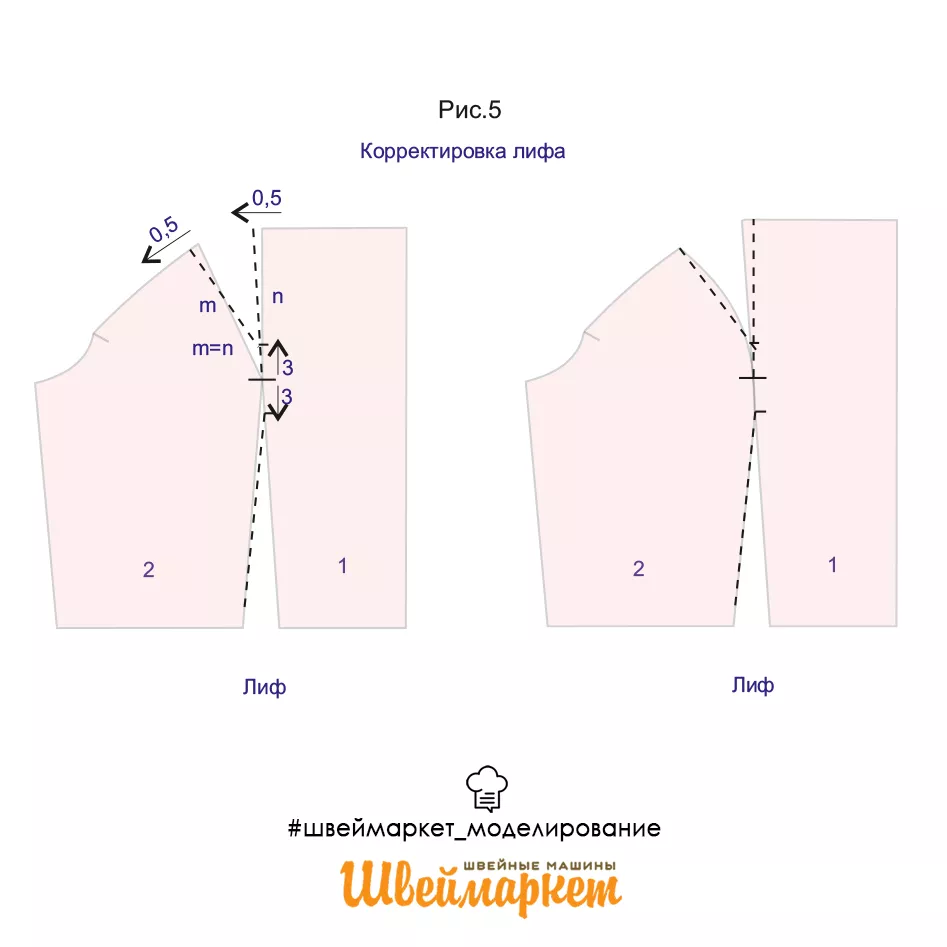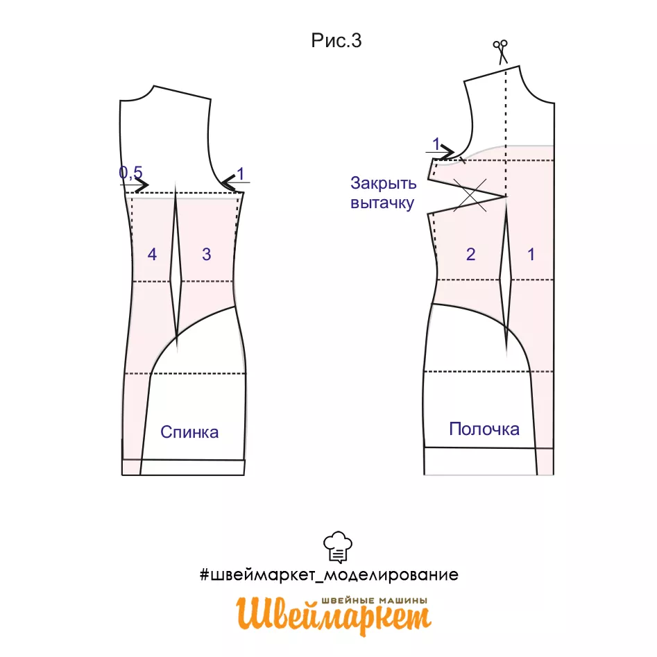 5. Чтобы грудь имела выпуклую, а не острую форму, вершины нагрудной и талиевых вытачек смещаем на 3см от центра груди (впоследствие, здесь будем рисовать дугу).
