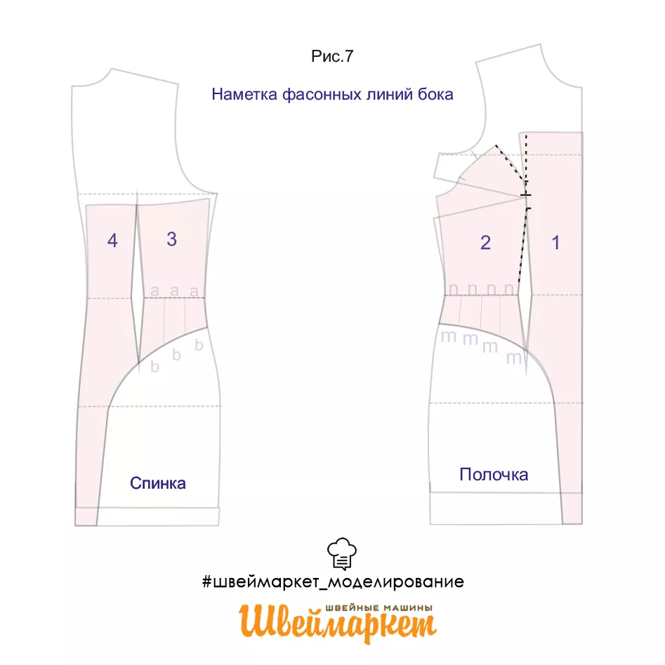 6. Намечаем верхнюю линию боковой детали. Измеряем расстояние n на центральной детали и откладываем такое же m (m=n) на боковой(по линии смещенной вытачки). Плавной линией соединяем с проймой.