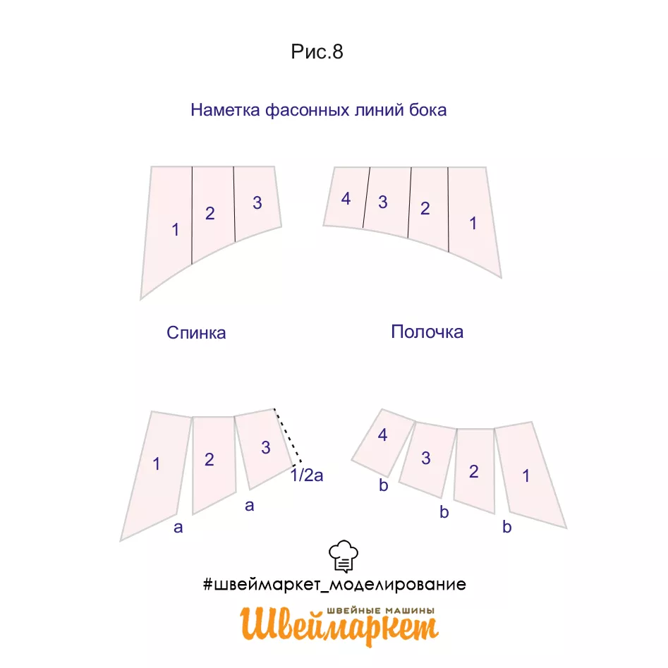 7. По модели, низ боковой детали имеет форму небольшого “крылышка”. Для этого нужно сделать раздвижку. Линию талии боковой детали делим на 4 равных отрезка и соединяем их с точками на дуге, поставленных, соответственно, на равном расстоянии.