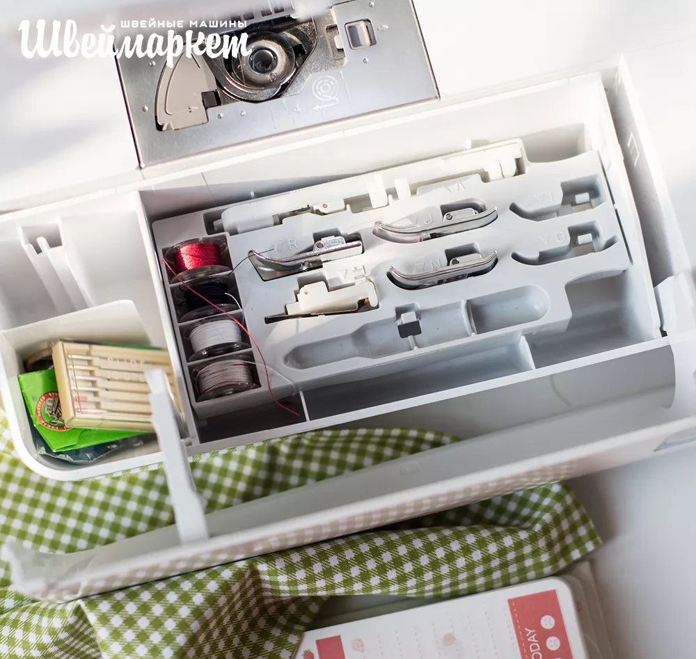 Нравится дизайн, выглядит очень просто и элегантно, мне такой концепт по душе, на фото кажется легкой и компактной, но в жизни понимаешь, что внутренний мир этой машины очень весомый - целых 14 кг! Это существенный плюс, машина не прыгает и не скачет, если шить на всех скоростях.