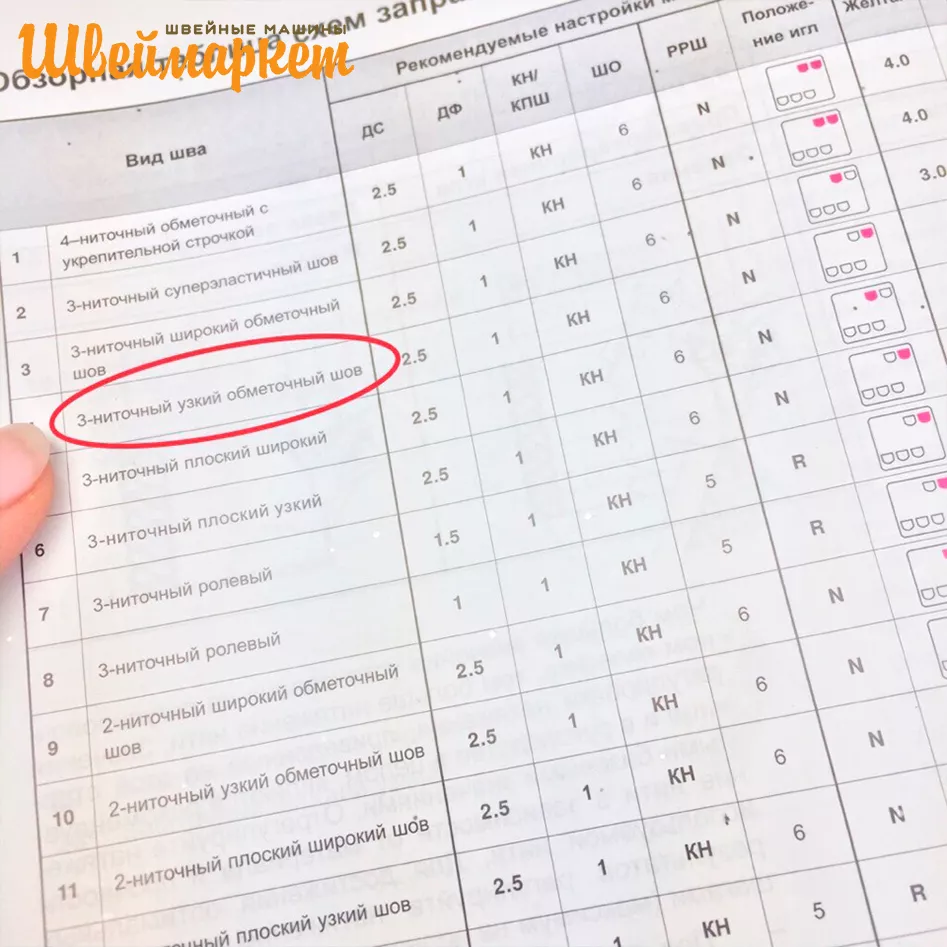 1. Тестируем лапку, пришивая тесьму на оверлоке. Установить настройки соответсвенно 3-ниточному узкому обметочному шву.