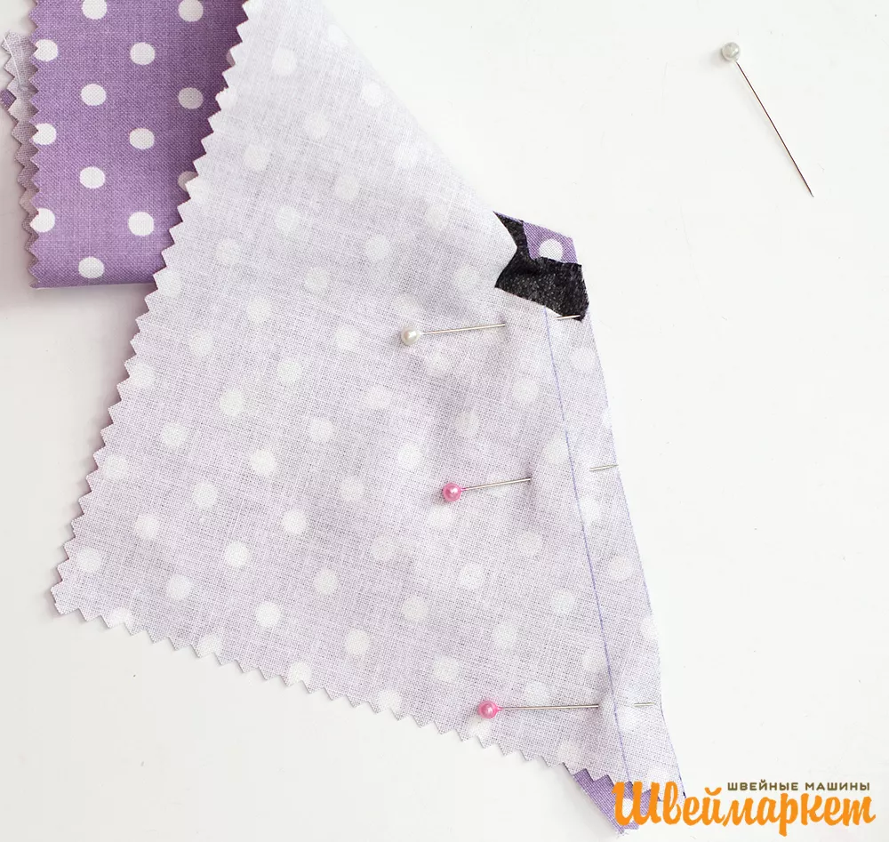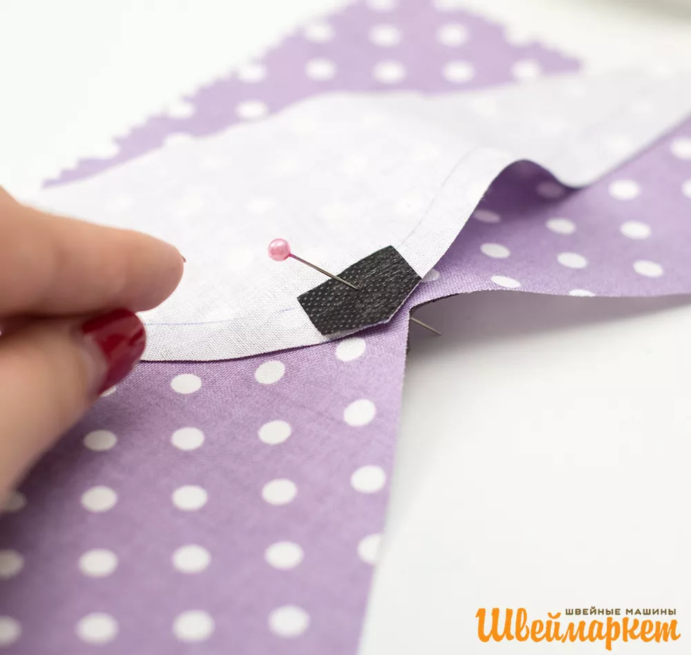 3. Основную деталь складывают с кокеткой лицом к лицу, уравнивают срезы. Очень важно правильно совместить точки углов деталей. Можно зафиксировать сразу точки с помощью булавки или сметкой.