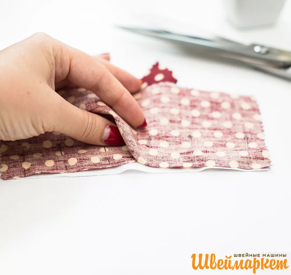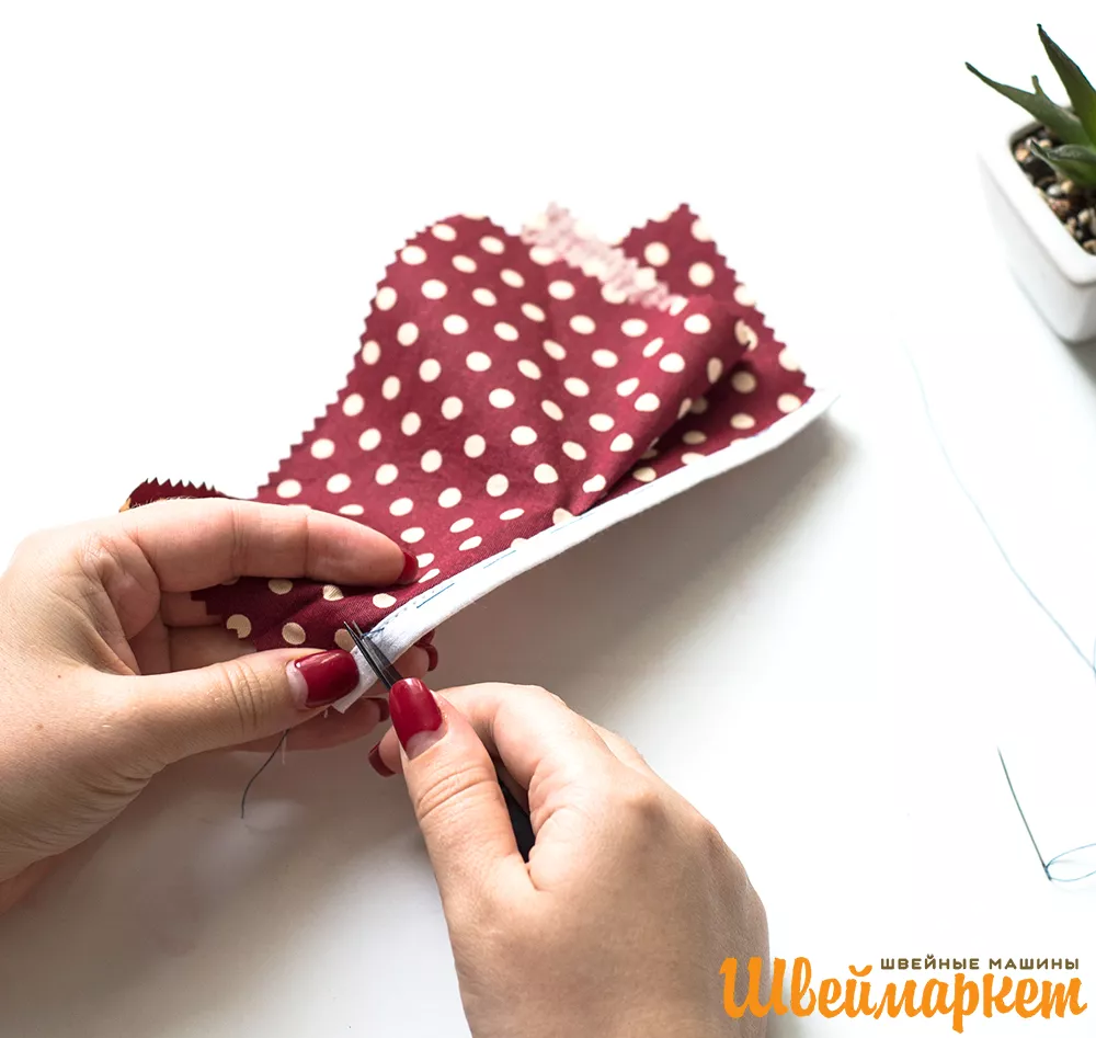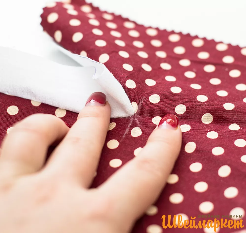 10. Закрепляем с изнанки основной детали уголок бейки под углом 45 градусов.