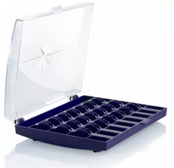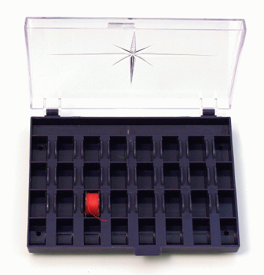 Бокс для хранения шпулек из пластика сливового цвета с прозрачной крышкой предлагает место 32 шпулям швейных машин всех популярных систем. Будь то СВ-шпули, шпули для двойного вращающегося челнока или горизонтального челнока: Все шпули для швейных машин можно хранить наглядно и упорядоченно.