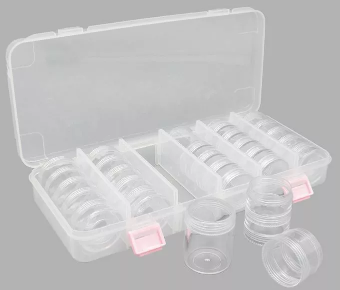 Контейнер для организованного хранения бисера, стекляруса, бусин, а также различных мелочей. Состоит из футляра на 6 секций с крышкой, а также футляров цилиндрической формы.