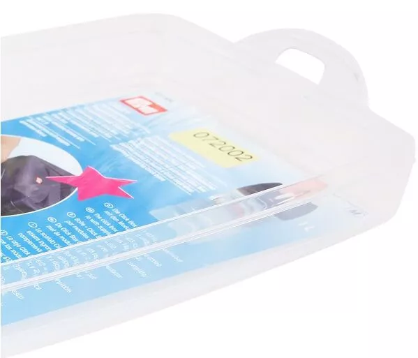 Этот практичный клик-бокс содержит на трех этажах много места для хранения принадлежностей для шитья, рукоделия или хобби. Нижние части выполнены из надежного, прозрачного пластика и имеют на коротких сторонах по два защелкивающихся замка, благодаря которым они крепятся друг к другу. Крышка сливого-синего цвета также из пластика. Белая ручка может откидываться для переноски и в сложенном состоянии не выступает за высоту крышки. Клик-бокс включает в себя три модуля.