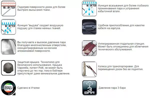 Съемный котел облегчает выполнение операций по его обслуживанию. Функция "выдувание" позволяет приподнять тонкие деликатные вещи для разглаживания только при помощи пара. Функция «втягивание» позволяет зафиксировать ткань на поверхности доски, что препятствует образованию складок. Нагревание позволяет подсушить ткань
