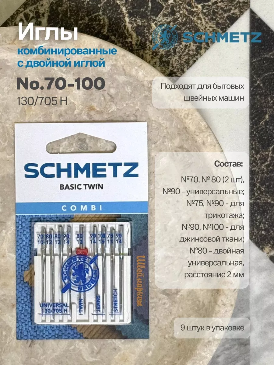 Иглы Schmetz комбинированные 130/705H №№ 70,80(2),90;75,90(S);90,100(J);80/2.0, 9 шт.