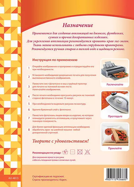 Применяется для аппликации на ткань, сумки, деревянные поверхности, и прочие декоративные изделия.
