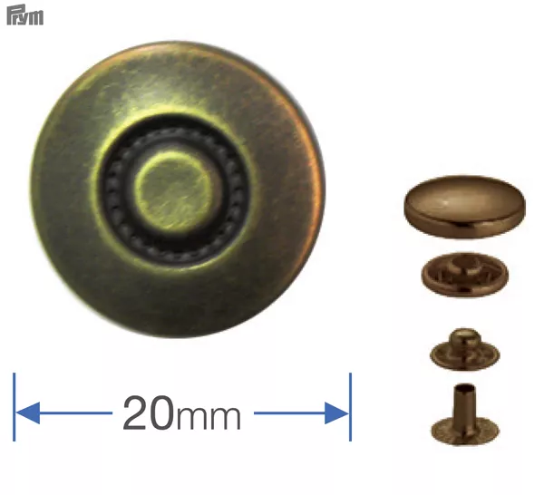 Диаметр – 20 мм, отличаются оригинальным дизайном и ретро-цветом состаренной латуни. Предназначены для тканей средней плотности, подойдут как для одежды, так и для сумок и других аксессуаров. 6 пар, в комплекте идет установщик.