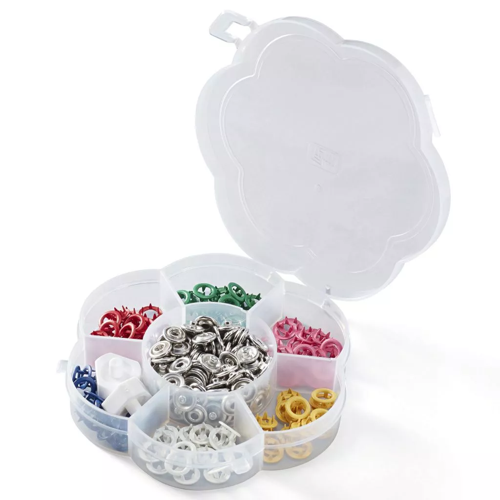 Этот практичный защелкивающийся цветочный контейнер из высококачественного пластика, который можно использовать и для хранения, содержит 60 непришивных кнопок «Jersey» 6 разных цветов.