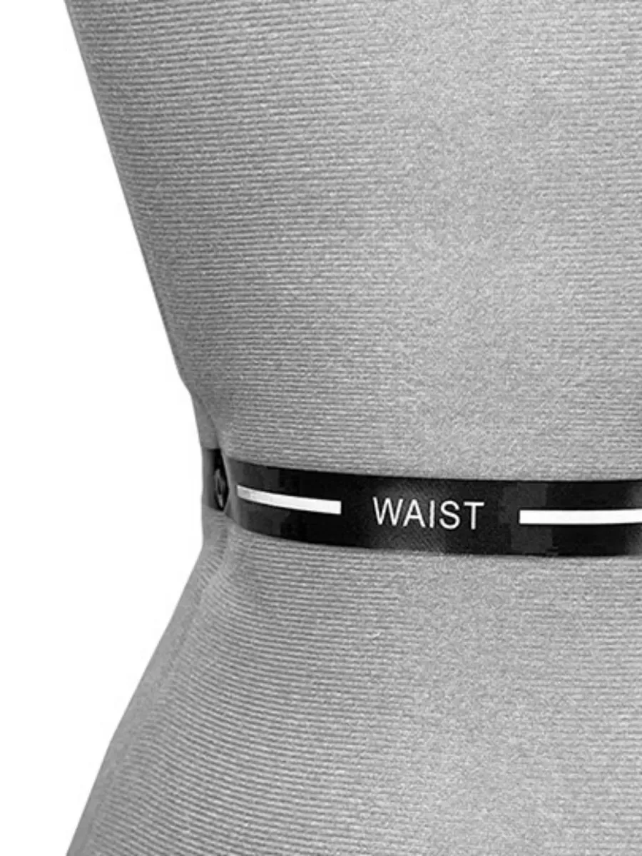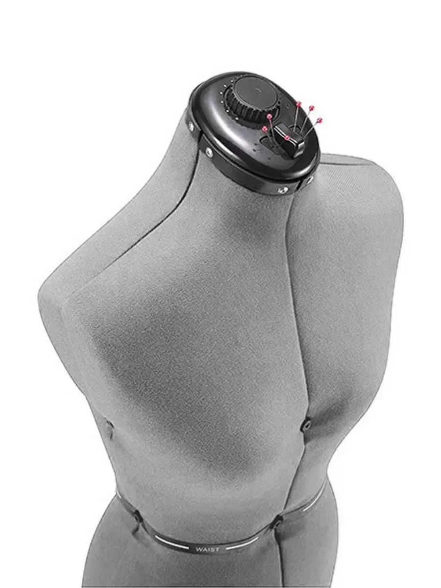 Внешнее покрытие из поролона позволяет легко закреплять даже плотные и тяжёлые ткани. Для работы предусмотрены подушечка для булавок и держатель ключей. Манекен выполнен в сером цвете.