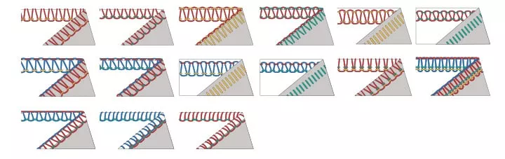4-х ниточный оверлочный шов с укрепительной строчкой, 3-х ниточный плоский шов-имитация (широкий), 3-х ниточный плоский шов-имитация (узкий), 3-х ниточный оверлочный шов (сверхэластичный), 3-х ниточный оверлочный шов (широкий), 3-х ниточный оверлочный шов (узкий), 3-х ниточный узкий шов, 3-х ниточный ролевый подрубочный шов, 2-х ниточный плоский шов-имитация (широкий), 2-х ниточный плоский шов-имитация (узкий), 2-х ниточный оверлочный шов (широкий), 2-х ниточный оверлочный шов (узкий), 2-х ниточный ролевый шов, 2-х ниточный подрубочный шов (широкий)2-х ниточный подрубочный шов (узкий).