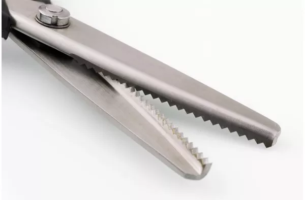 Ножницы зиг-заг ВОЛНА AURORA AU 490. Предназначены для обработки краёв и срезов ткани, фетра, бумаги, обивочных и подкладочных материалов. Зубчатые лезвия позволяют обойтись без обметывания срезов, предотвращают осыпание ткани. Для ручек использована качественная термостойкая пластмасса