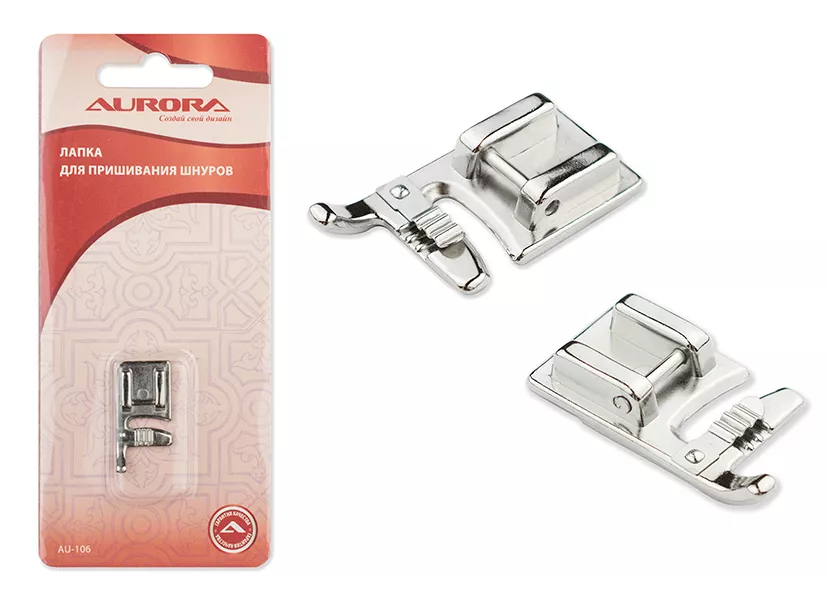 Лапка Aurora для пришивания шнуров предназначена для украшения изделий декоративными шнурами и нитями. Лапка применяется при пришивании от 1 до 3-х тонких кордовых шнуров. При помощи этой лапки Вы можете пришить тонкий шнур или пряжу, сделать окантовку на одежде или на декоративных изделиях.