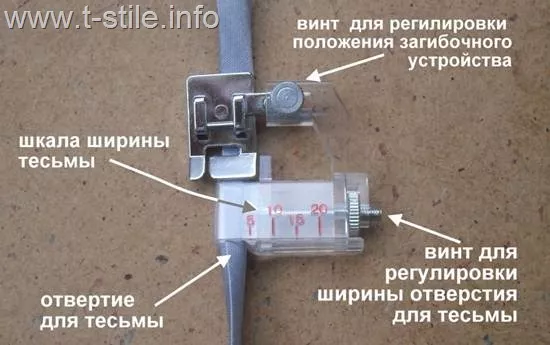 Окантовочная тесьма вставляется в отверстие для тесьмы, ширина которого регулируется винтом на загибочном устройстве.