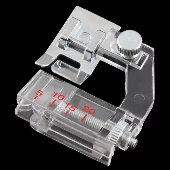 Шкала на лапке позволяет видеть, какую ширину имеет вставленная тесьма, но закручивать винт нужно не по шкале, а по ощущениям. Нужно закрутить винт так, чтобы тесьма внутри устройства двигалась с усилием. Хорошая фиксация тесьмы внутри лапки не позволит ей смещаться, следовательно, окантовывание будет выполнено качественно.