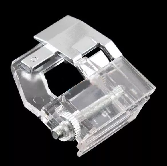 Лапка имеет прозрачное загибочное устройство, которое помогает подавать окантовочную тесьму или бейку под лапку так, чтобы она перегибалась посередине и ее края были на одном уровне. Положение загибочного может меняться и фиксироваться с помощью специального винта на лапке. Регулировать положение загибочного устройства необходимо для того, чтобы строчка проходила на расстоянии 1-2мм от края окантовки.