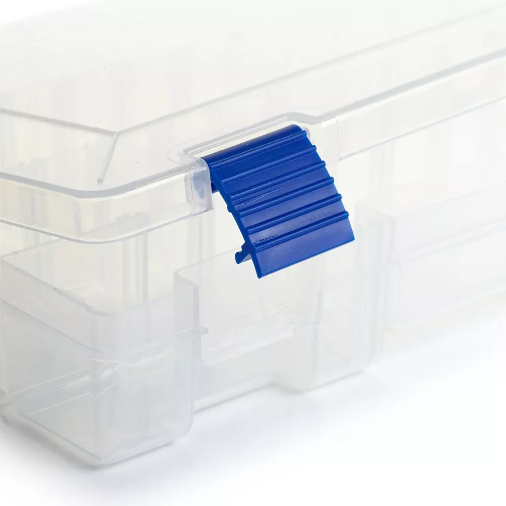 Через прозрачные пластмассовые стенки органайзера с прочной застежкой сразу видно, какие принадлежности в нем лежат. Органайзер поставляется без содержимого.