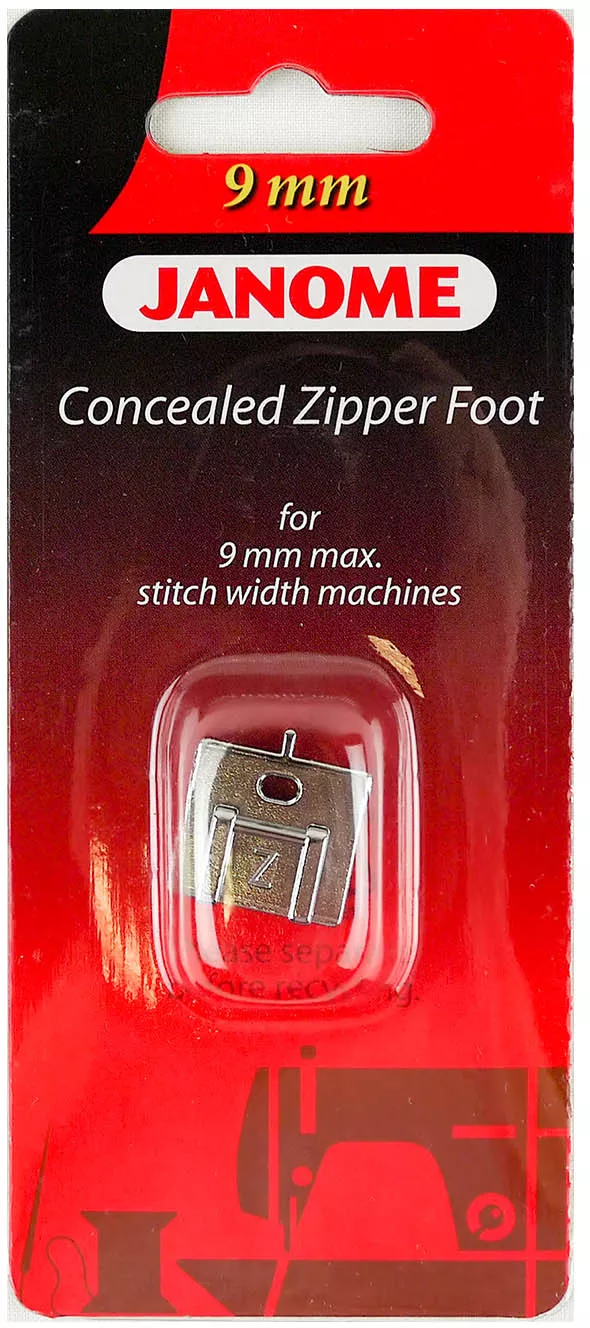 Лапка для потайной молнии предназначена для использования на швейных машинах Janome с горизонтальным челноком и шириной зигзага 9 мм.