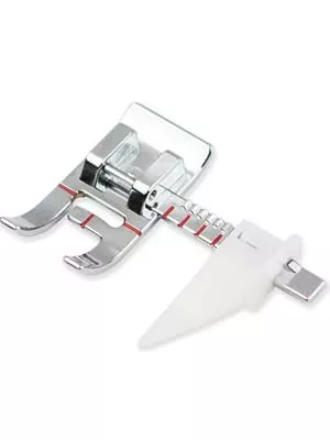 Лапка используется для шитья с отступом от края ткани до 27мм, а также для выполнения параллельных строчек. Направитель позволяет регулировать и задавать расстояние между строчками.