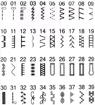 стандартная зигзаг, для обметывания петель, для вшивания молнии, для потайной строчки, для пришивания пуговиц |