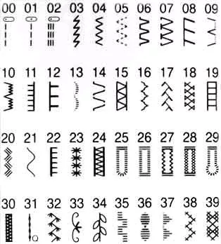 стандартная зигзаг, для обметывания петель, для вшивания молний, прозрачная для атласных тканей, для декоративных строчек и монограмм, для потайной строчки, для пришивания пуговиц, оверлочная |