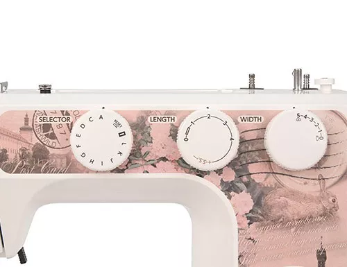 Удобная и понятная регулировка параметров строчек с помощью трёх регуляторов. Первым выбираем вид строчки, средним длину стежка, а также переключаемся на строчки нижнего ряда S.S., последним ширину зигзага.