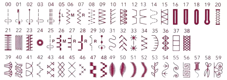 аппликации, гофрированная, зигзаг, потайные, прямая (левое положение иглы), прямая (центральное положение иглы), пунктирная, рабочие, соединительная, штопка, эластичная для пришивания резинки, эластичный зигзаг |