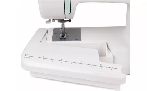 - Дополнительный съемный столик имеет отсек для хранения аксессуаров с держателями для шпулек. На внешнюю сторону столика нанесена разметочная линейка в сантиметрах и дюймах.