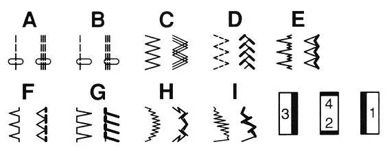 гофрированная, зигзаг, потайные, прямая (левое положение иглы), прямая (центральное положение иглы), пунктирная, соединительная, штопка, эластичная для пришивания резинки, эластичный зигзаг |