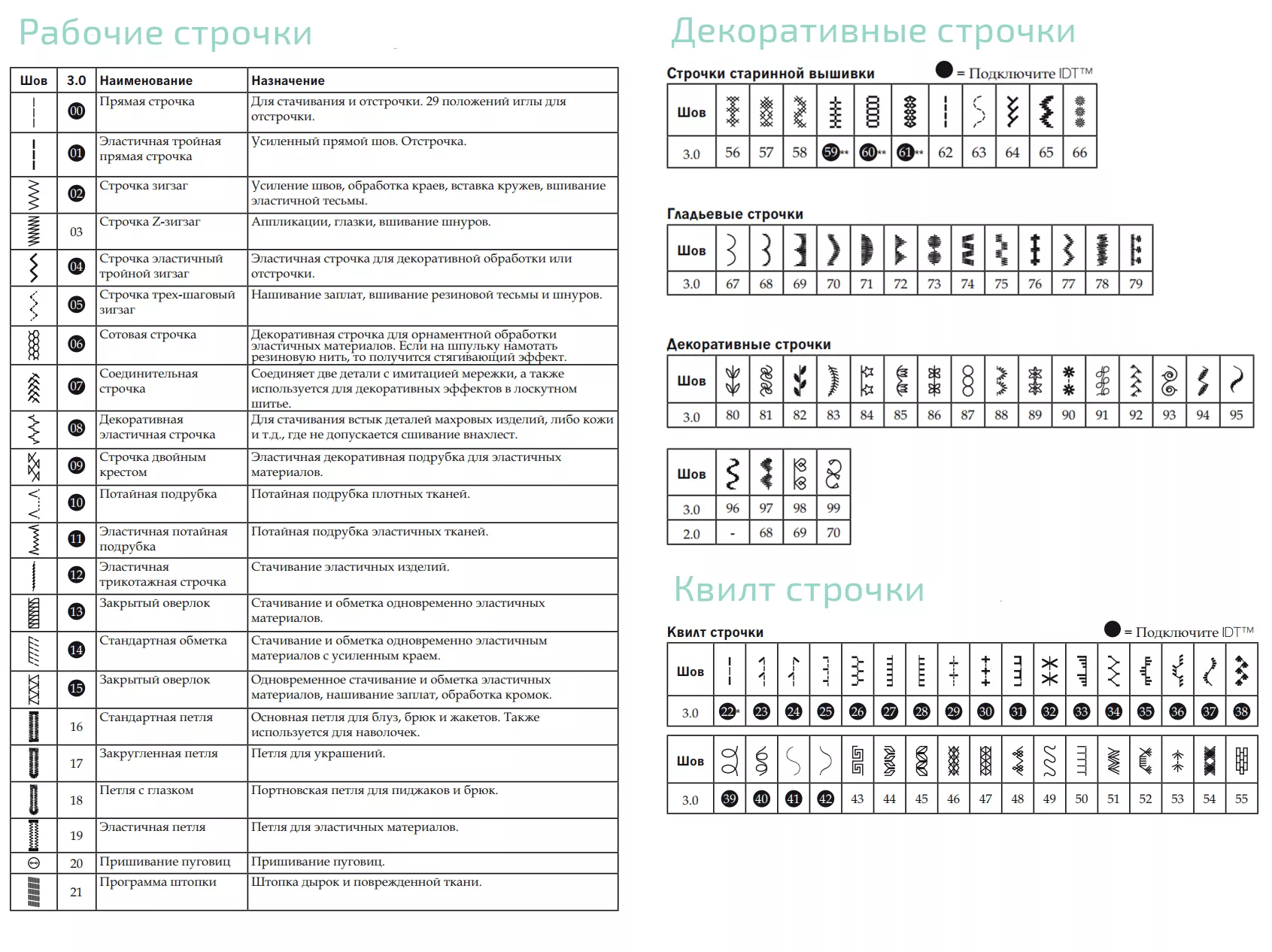 стандартная-зигзаг с IDT, для вшивания молнии с IDT, для атласных строчек, для атласных строчек с IDT, для обметывания петли, для потайной строчки с IDT |