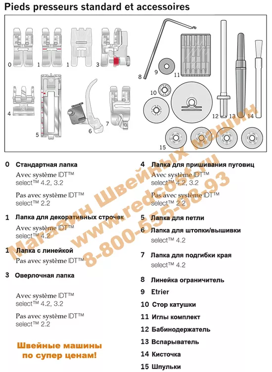 стандартная-зигзаг с IDT, для обметывания петель, для вшивания молнии с IDT, для потайных и оверлочных швов с IDT, прозрачная для декоративных строчек |