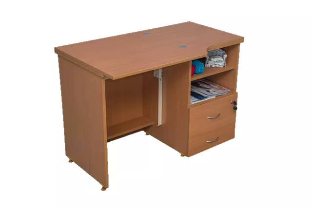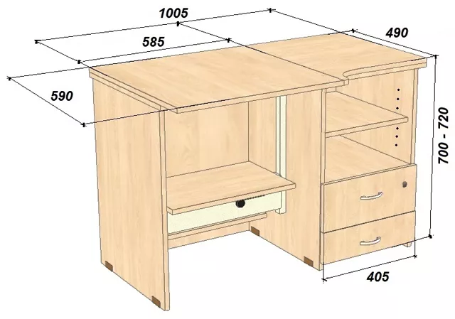 В правой части стола расположены два выдвижных ящика и ниша с полочкой регулируемой по высоте свободного назначения (утюг, оверлок, кастрюли, сковородки и т.д.).