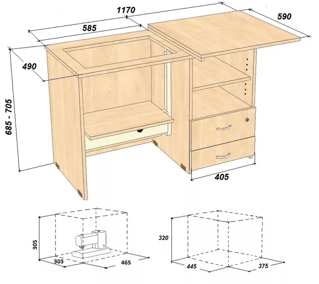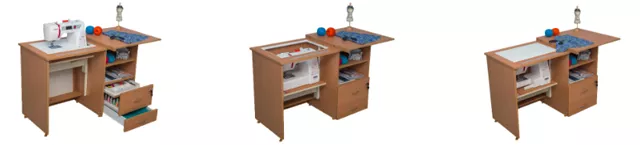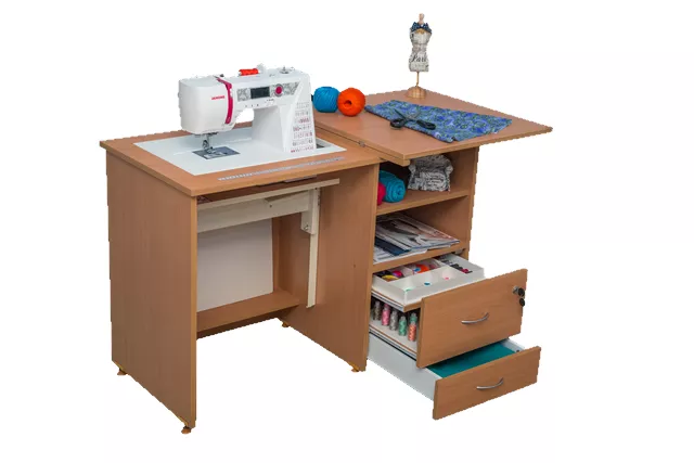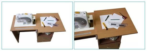 При необходимости достать машину, верхняя крышка стола откидывается вправо, образуя при этом удобную раскройную поверхность и т.д., а машина извлекается из стола при помощи подъемного механизма.