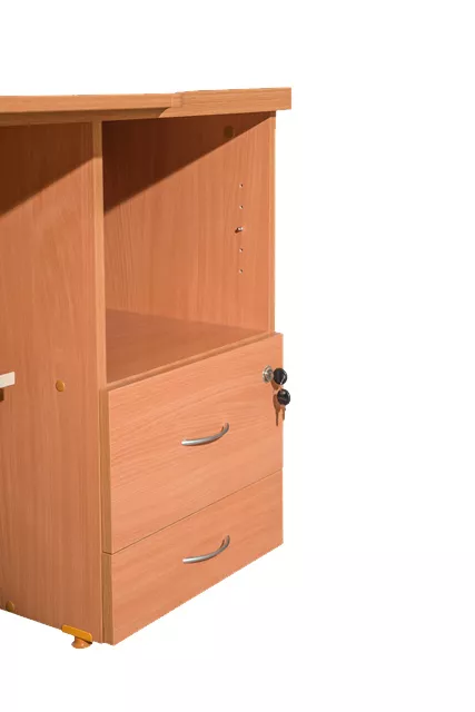 В верхнем ящике расположена катушечница на 56 катушек и секционный контейнер. Ящик закрывается на ключ, что позволяет преподавателю ограничить доступ учащихся к школьному инвентарю ранее, чем это необходимо для урока. Секционный контейнер позволяет правильно произвести раскладку необходимых для урока инструментов. В нижний ящик можно положить небольшие лоскуты тканей или другие более крупные предметы.