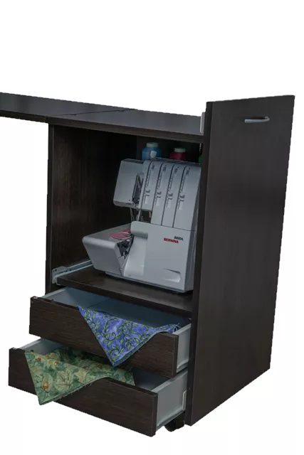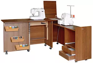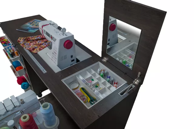 Легко трансформируемый швейный центр, который позволяет организовать рабочее место швеи. В столе предусмотрено место для хранения и использования швейной машины и оверлока.
