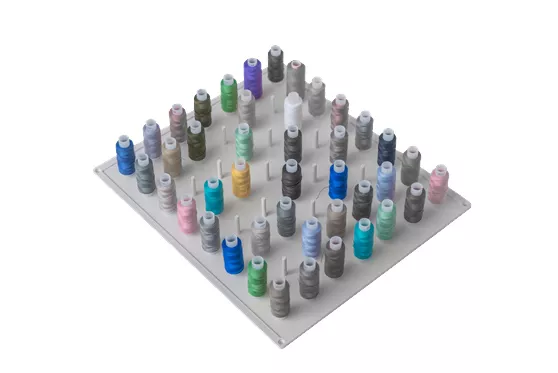 Над нишей для хранения оверлока расположена регулируемая по высоте полочка,а над ней удобная выдвижная подставка для 56 катушек.