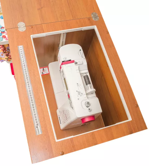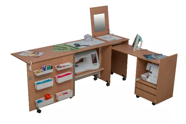 Благодаря оригинальной конструкции выкатной тумбы, которая образует полноценную рабочую поверхность, за этим столом удобно работать как на швейной машине, так и на оверлоке.