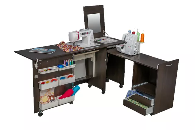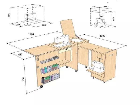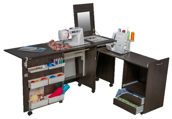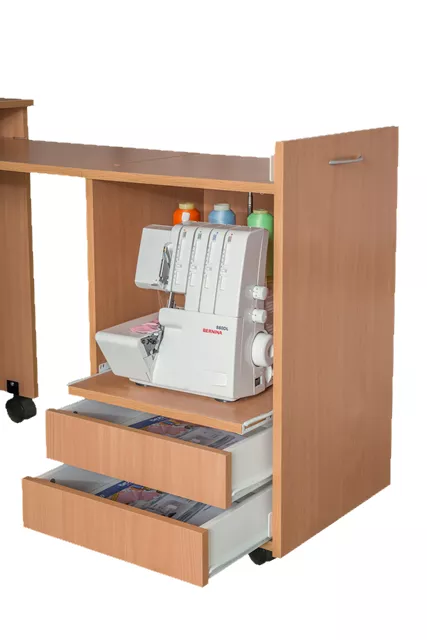 Благодаря оригинальной конструкции выкатной тумбы, которая образует полноценную рабочую поверхность, за этим столом удобно работать как на швейной машине, так и на оверлоке.