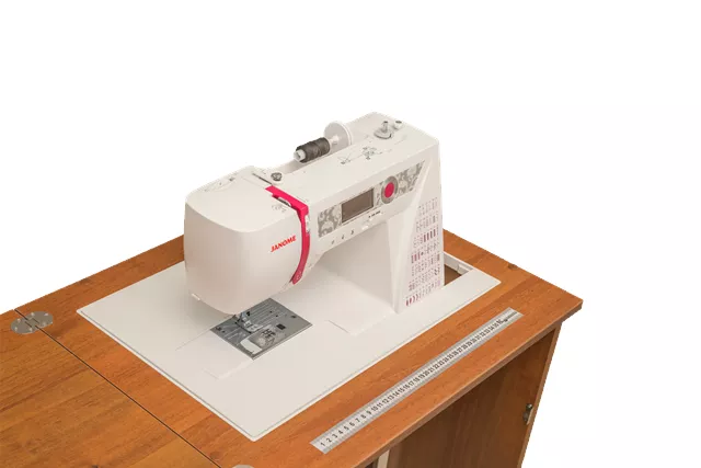 - Второе - для шитья, когда рабочая платформа машины находится на одном уровне с поверхностью стола, что создает дополнительный комфорт в работе. В данном положении рекомендуется использовать вставку для комфортного шитья.