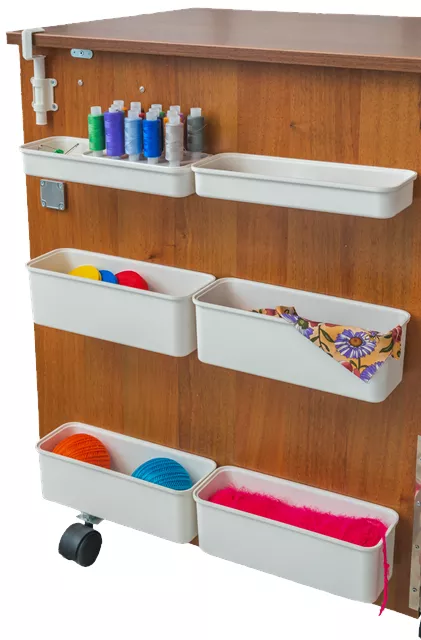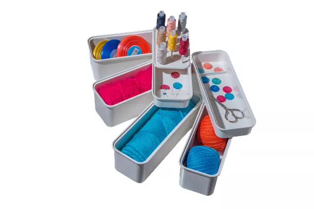 2. Контейнеры для швейных принадлежностей (4 глубоких и 2 мелких), игольница, подставка для катушек
