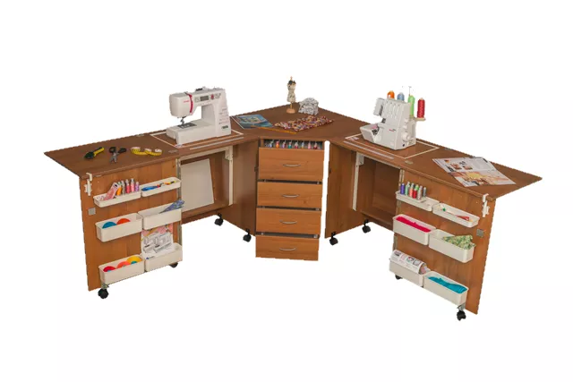 С этим столом Вы сможете создать настоящий уголок творчества! Благодаря оригинальной конструкции, устанавливается в любой угол комнаты. Стол оснащен лифтом для подъема как швейной машины так и оверлока.