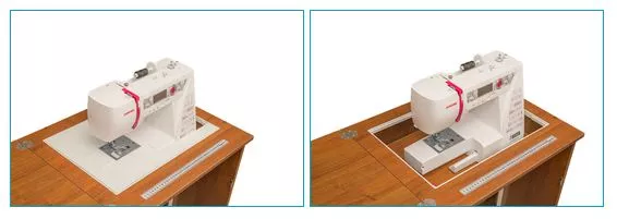 - Второе - для шитья, когда рабочая платформа машины находится на одном уровне с поверхностью стола, что создает дополнительный комфорт в работе. В данном положении рекомендуется использовать вставку для комфортного шитья.