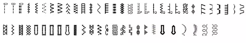 стандартная зигзаг, для обметывания петель, для вшивания молнии, для пришивания пуговиц, оверлочная, для атласных строчек, для соединительных строчек |