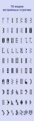 прямая, зигзаг, рабочие, декоративные, оверлочные, потайные, сотовая, штопка, эластичные, крестообразные, атласные сатиновые |