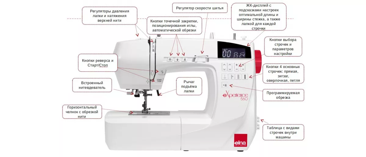 Elna eXperience 560 очень легко и быстро заправить. Она оснащена горизонтальным челночным устройством с обрезкой нити, а на панель нанесена схема заправки верхней нити. В комплектацию входят отсек для аксессуаров, дополнительные лапки, и специальные отвертки для тех случаев, когда будет необходимо разобрать корпус.Данная модель отлично подойдёт, как для новичков, так и для профессионалов.