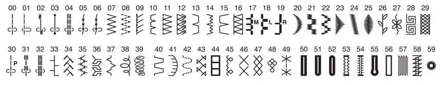 | аппликации, гофрированная, декоративные, зигзаг, имитация оверлока, имитация ручного квилтинга, квилтинг, мережка, оверлочные, фестончатая, потайные, прямая, пунктирная, пэчворк, рабочие, соединительная, трикотажные, узоры, штопка, эластичная для пришивания резинки, эластичный зигзаг |