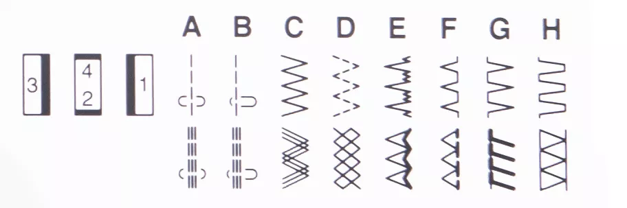 гофрированная, зигзаг, потайные, прямая (левое положение иглы), прямая (центральное положение иглы), пунктирная, рабочие, соединительная, штопка, эластичная для пришивания резинки, эластичный зигзаг |